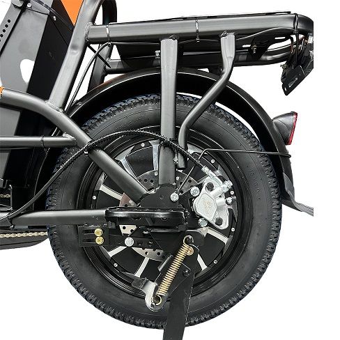 Рама электровелосипеда изготовлена из прочного материала, который выдерживает нагрузку до 200 кг. Крылья защищают ноги от грязи и брызг, а размер колес в 16 дюймов увеличивает проходимость даже на неровных дорогах.